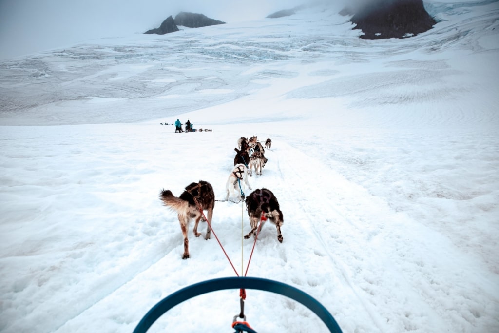 Além de oferecer uma visão panorâmica desta paisagem deslumbrante, os passeios de helicóptero geralmente incluem um pouso em uma das geleiras, onde há a oportunidade de experimentar trenós puxados por cães.