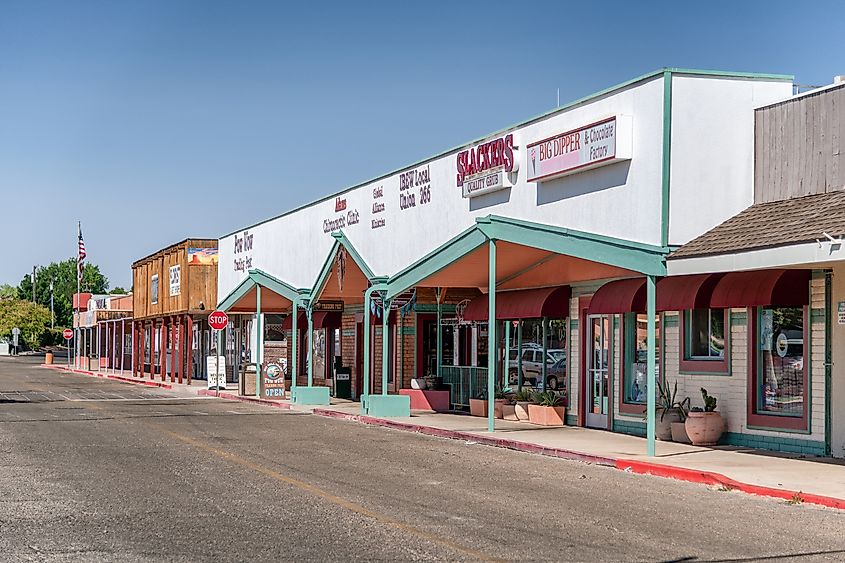 Lojas alinhadas ao longo da Bullard Street, no centro de Silver City, Novo México. Crédito editorial: Underawesternsky/Shutterstock.com