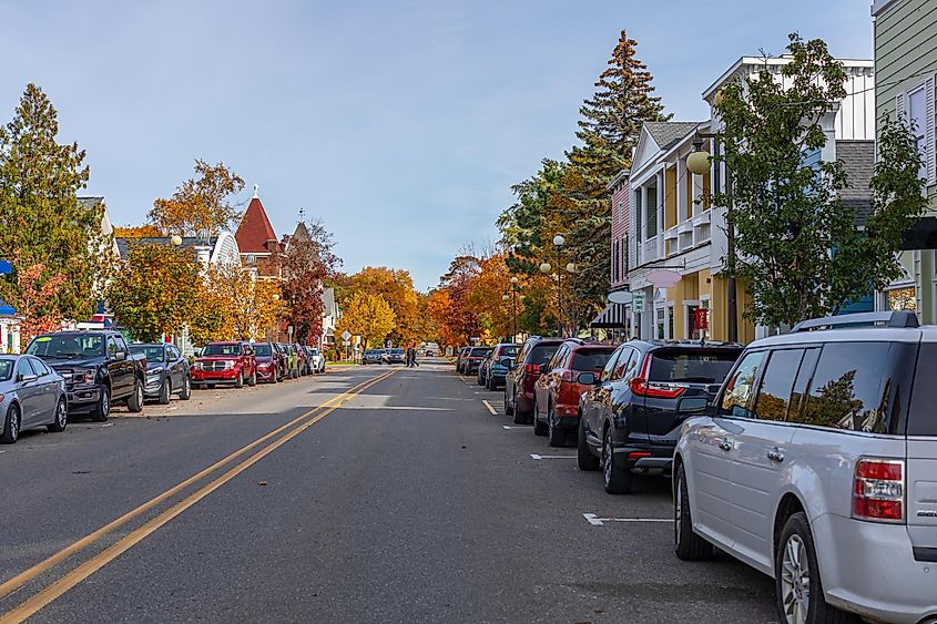 A vista ao norte da Howard St oferece um vislumbre de Little Traverse Bay, próximo ao Lago Michigan, um cenário que torna esta pitoresca cidade um resort costeiro popular, via Kenneth Sponsler / Shutterstock.com