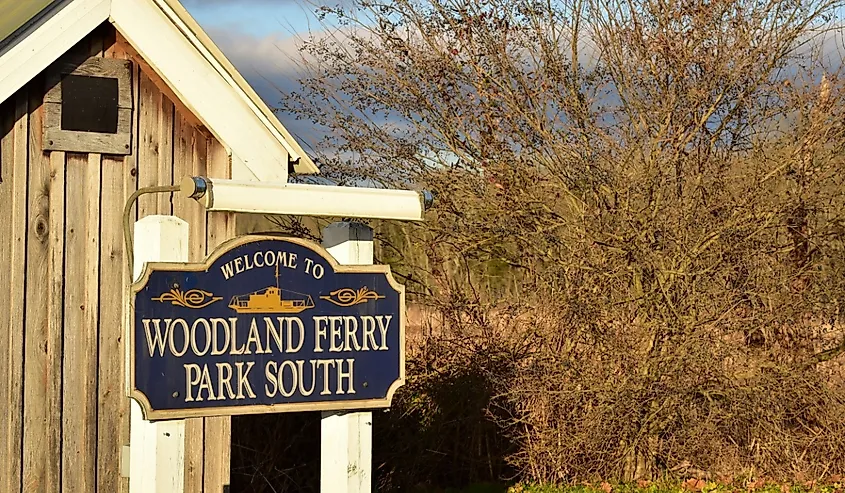 Placa icônica histórica do Woodland Ferry, que conecta Laurel a Seaford, Delaware.