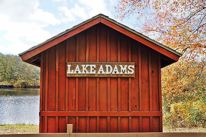 Uma casa-barco de madeira vermelha com vista para um lago de água doce em Exeter, RI. Crédito editorial: Carol Ann Mossa / Shutterstock.com