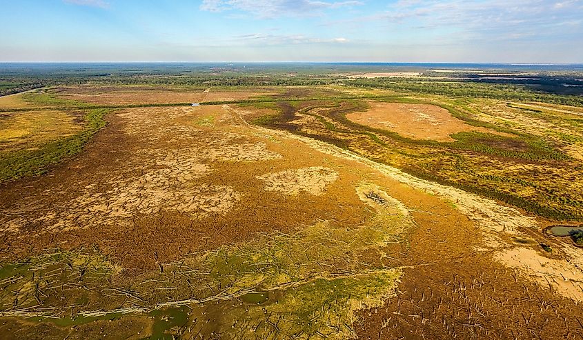 Vista aérea do reservatório de freio Bussey em Bastrop, Louisiana.