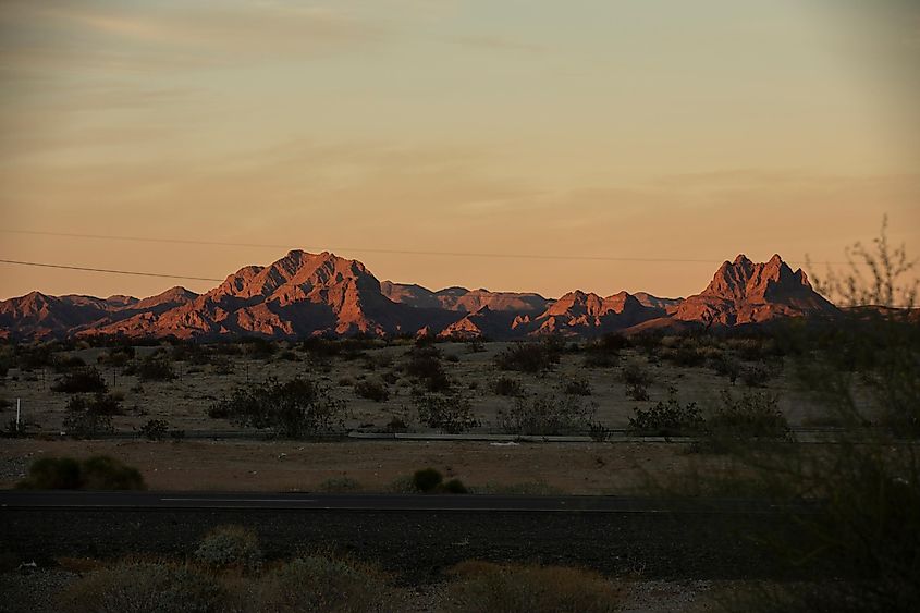 A luz do pôr do sol brilha na paisagem do deserto e nas montanhas de Wellton, Arizona.