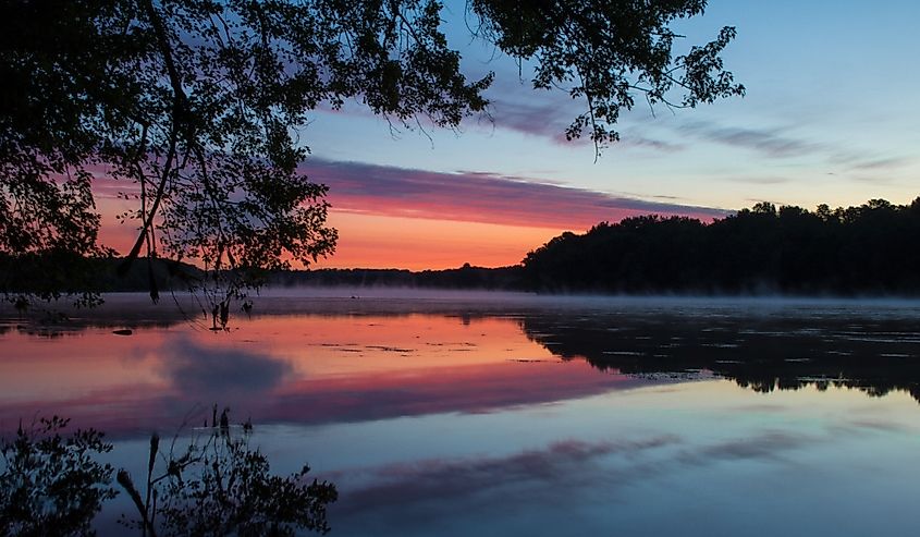 Nascer do sol refletido no rio Connecticut em Windsor Locks, CT