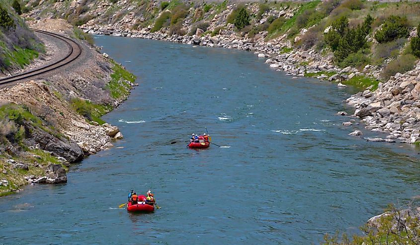 Rafting pelo pitoresco Wind River, Windriver Canyon, Wyoming. Crédito da imagem Grossinger via Shutterstock