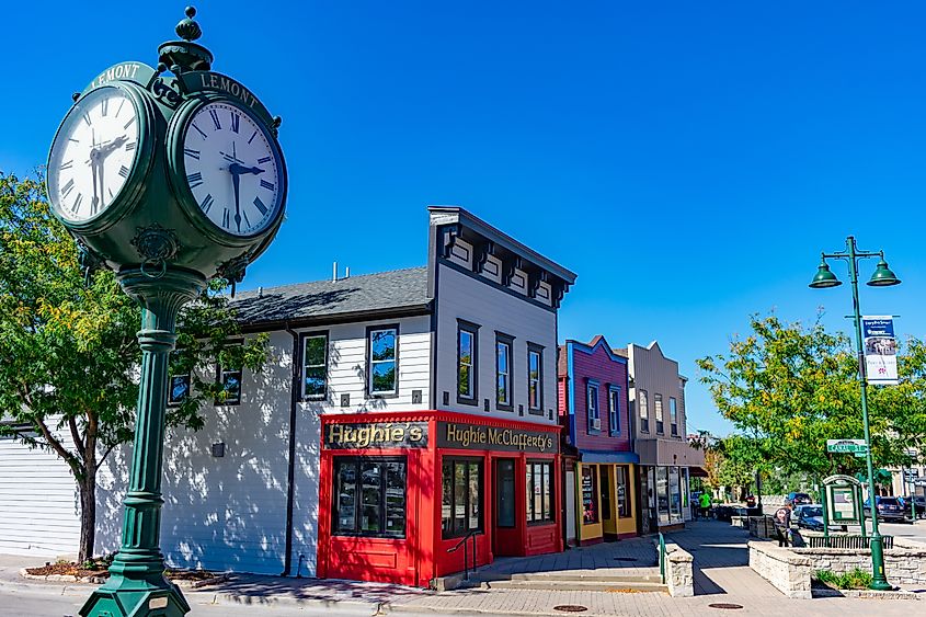 Relógio em Downtown Suburban Lemont, Illinois, via James Andrews1 / Shutterstock.com