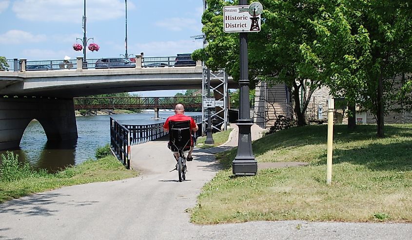 Um homem gosta de andar de bicicleta na trilha ao longo do rio Fox, em Genebra, Illinois.