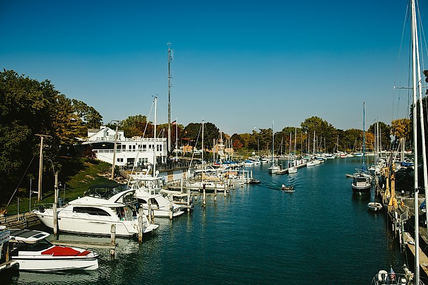 Porto com céu azul e muitos veleiros em cena de outono em Lake Forest, Illinois, via Cavan-Images / Shutterstock.com
