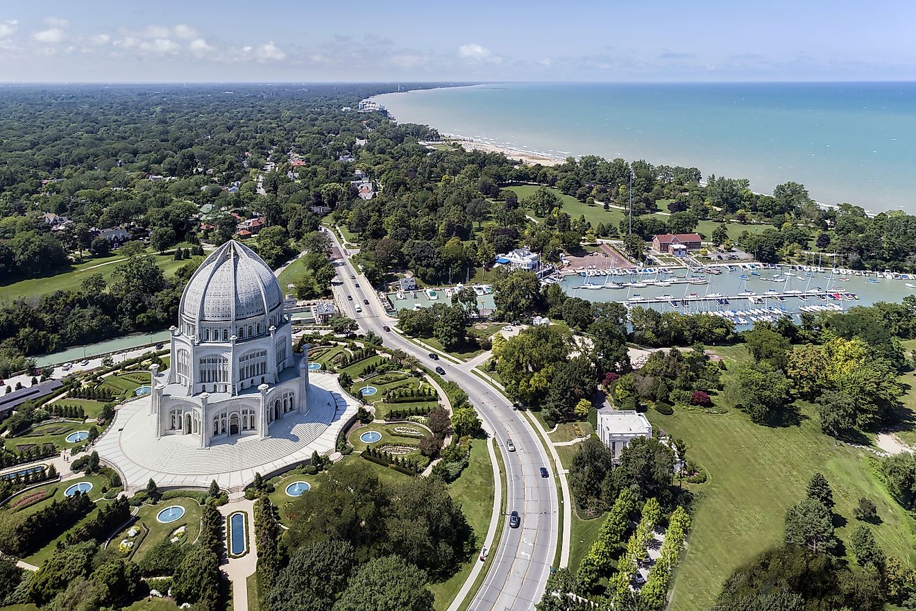 Vista aérea de um templo, porto e litoral em Wilmette, Illinois