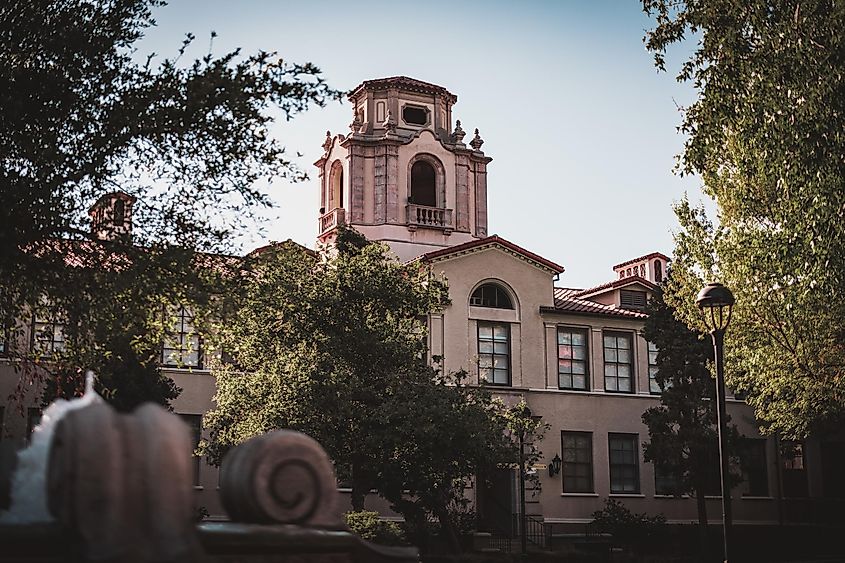 Uma bela foto externa do Pomona College, faculdade de artes liberais em Claremont, Califórnia.