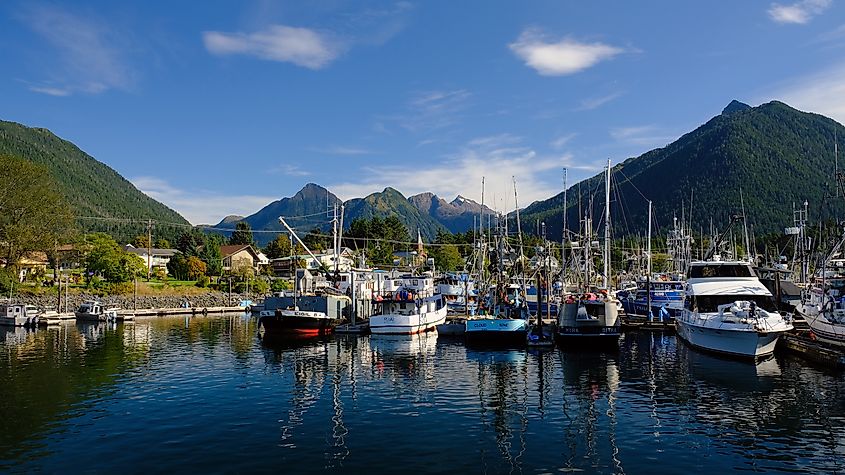 Porto de Sitka no verão. Sitka é um destino popular para navios de cruzeiro. Crédito editorial: Denbaim/shutterstock