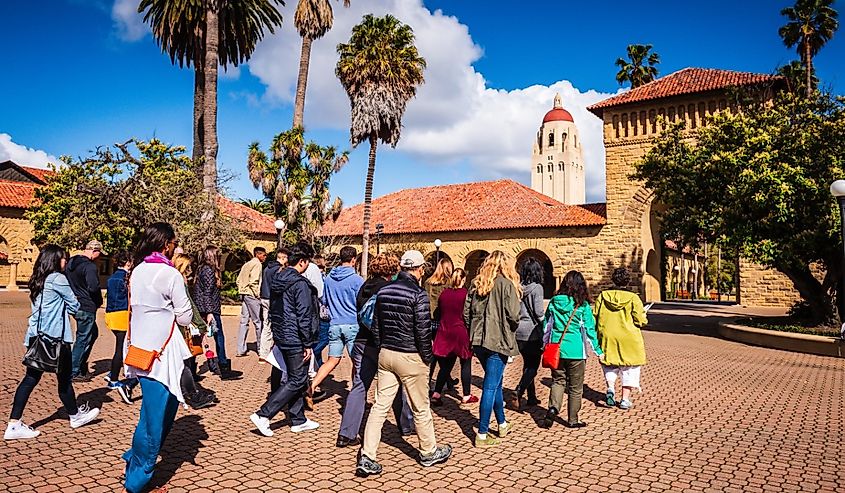 Um grupo de futuros alunos em um tour universitário na Universidade de Stanford, Stanford, Califórnia. Crédito da imagem Sandra Foyt via Shutterstock