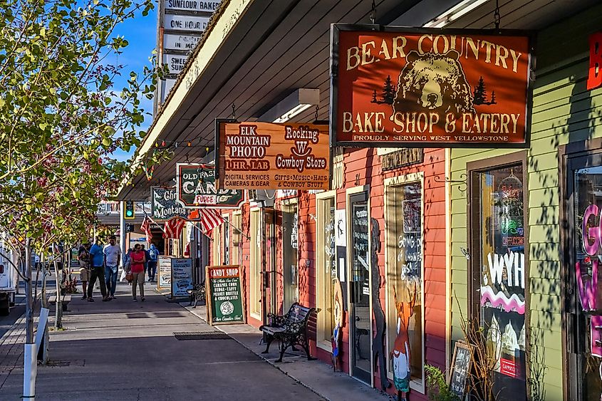 Lojas ao longo da Canyon Street em West Yellowstone, Montana. Crédito editorial: Matthew Thomas Allen via Shutterstock.com