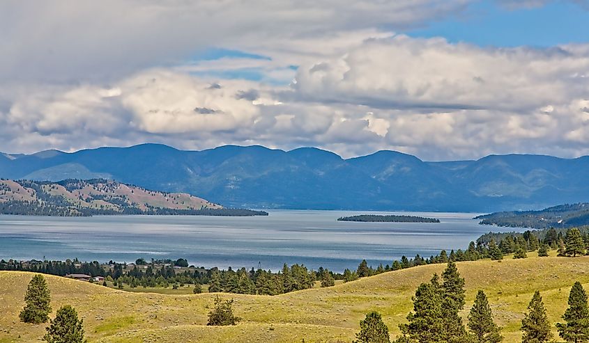 Uma vista panorâmica do Lago Flathead de Polson, Montana.