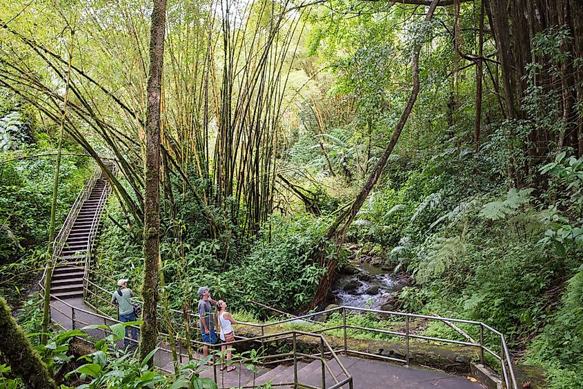 Turistas na trilha da cachoeira Akaka Falls no Akaka Falls State Park. Por Michael Gordon / Shutterstock.com