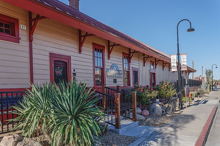 O edifício da Câmara de Comércio é o depósito original de Santa Fé em Wickenburg, Arizona. Crédito editorial: Rosemarie Mosteller / Shutterstock.com