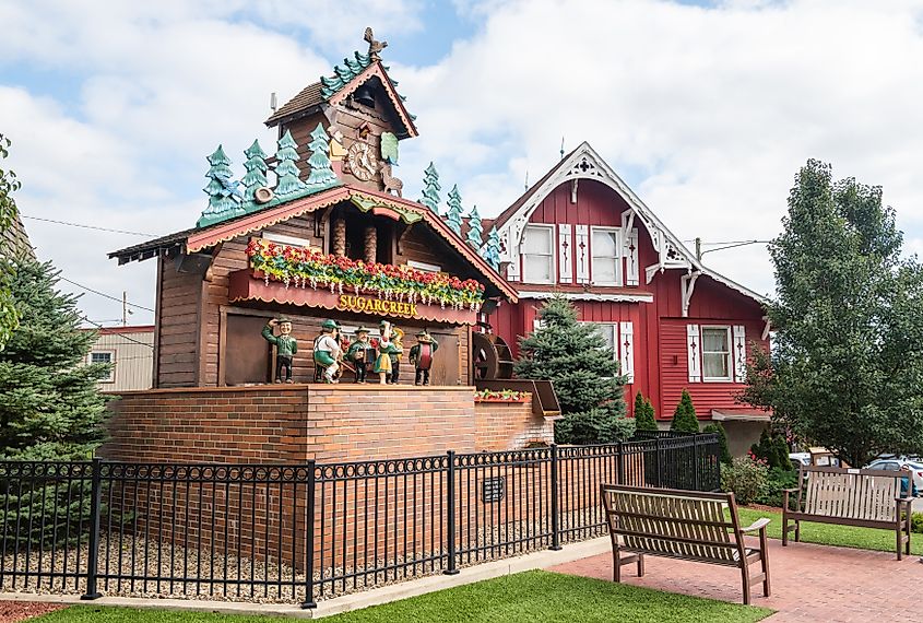 No centro da vila suíça em Sugarcreek, você encontrará o que foi listado como o maior relógio cuco do mundo pelo Livro Guinness de Recordes Mundiais em 1977. Com mais de 7 metros de altura e 7,2 metros de largura, um pássaro cuco sai do relógio a cada meia hora. Em seguida, surgem figuras de uma banda tocando polca suíça, e surge um casal dançando. O relógio foi transferido em 2012 para este local, tendo sido construído em 1972 e situado à porta de um restaurante em Wilmot. O relógio foi comprado pela Walnut Creek Cheese e doado a Sugarcreek, uma cidade turística com temática suíça, em 2012. Desde 1997, no entanto, um relógio cuco em Triberg-Schonach, Alemanha, afirma ser o maior relógio cuco do mundo, com o seu pássaro sozinho medindo 14 pés de comprimento e o pêndulo 26 pés de comprimento. Ainda certamente o maior relógio cuco dos Estados Unidos, o relógio de Sugarcreek deteve primeiro a maior distinção do mundo. Se você quiser visitá-lo, vá até a esquina da Main Street com a Broadway de Sugarcreek. A entrada é gratuita.
