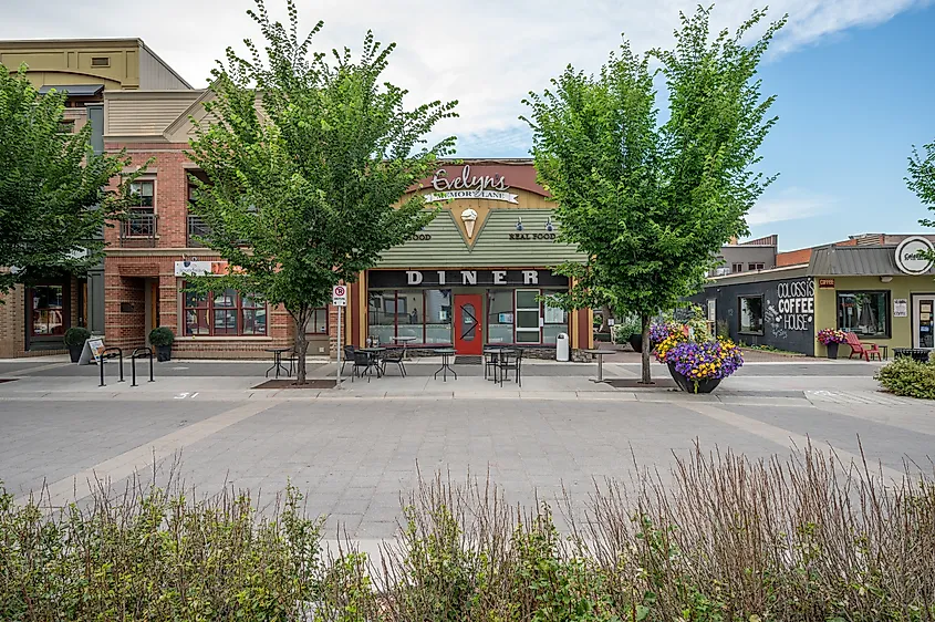 Empresas no centro da cidade de High River, em Alberta. Crédito editorial: Jeff Whyte/Shutterstock.com