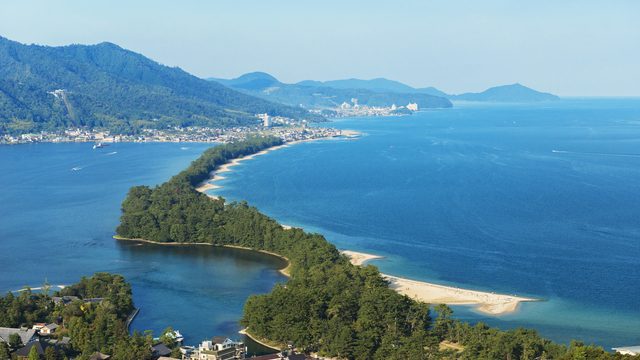 Amanohashidate é um banco de areia raro, densamente coberto por pinheiros. Diz-se que se chama “Amanohashidate” porque seu formato lembra uma ponte que se estende pelo céu. Como uma das Três Vistas Cênicas do Japão, é um destino popular em Kyoto! Dos mirantes, os visitantes podem apreciar o belo contraste entre o mar, o verde e a costa arenosa.