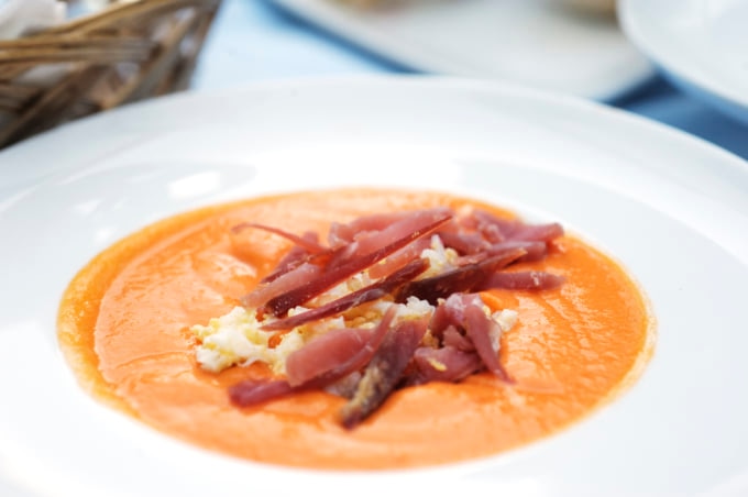 Semelhante ao gaspacho mais famoso, o salmorejo é uma sopa gelada, mais espessa e com sabor mais cremoso que seu primo culinário. O prato é extremamente simples: tomates frescos são misturados com alho, pão, azeite de alta qualidade e vinagre. Há algo tão reconfortante no salmorejo, especialmente num dia quente de verão, que nos faz preferi-lo ao gaspacho. Muitas vezes, os restaurantes completam o prato com jamón serrano ou queijo esfarelado para dar aquele fator de conforto extra.