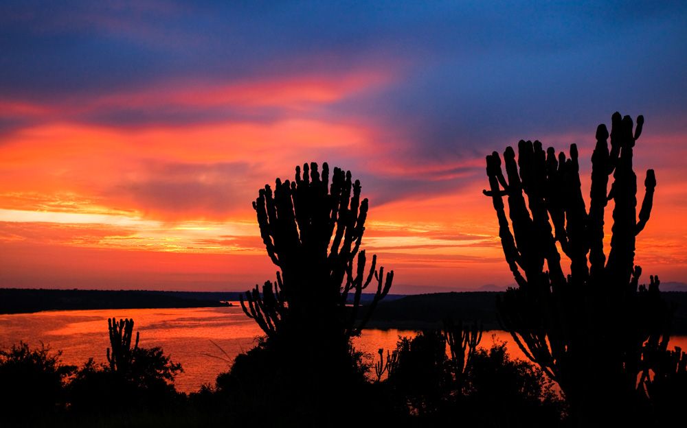 Nascer do sol sobre a Península de Mweya, Parque Nacional Rainha Elizabeth