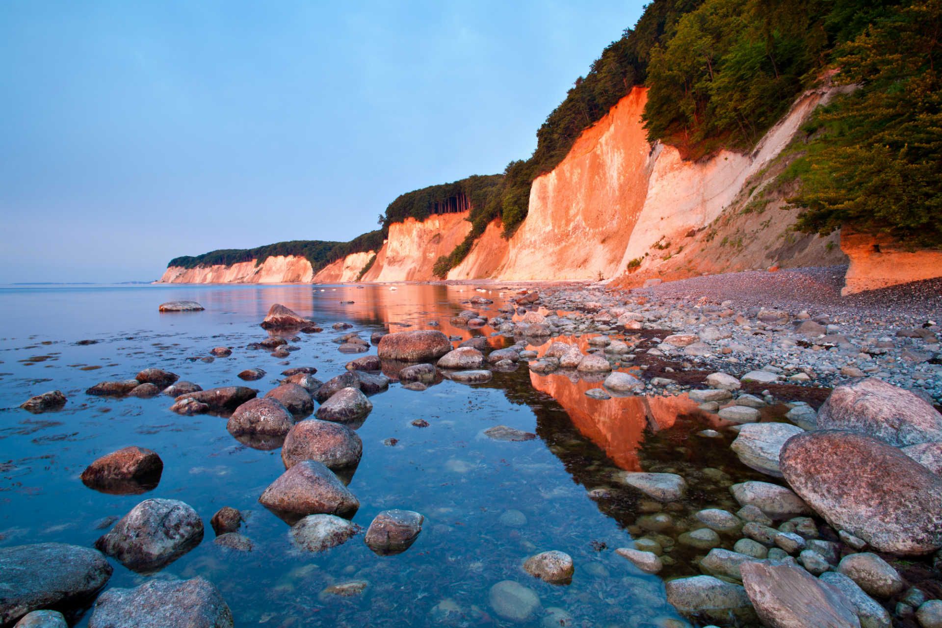 A maior ilha da Alemanha,Repreensões, é um lugar de praias varridas pelo vento, vilas de pescadores tranquilas e, o mais famoso, imponentes penhascos de giz branco. Localizadas no Parque Nacional Jasmund, estas falésias escarpadas erguem-se acima do Mar Báltico, emolduradas por antigas florestas de faias que ganharam o estatuto de Património Mundial da UNESCO.