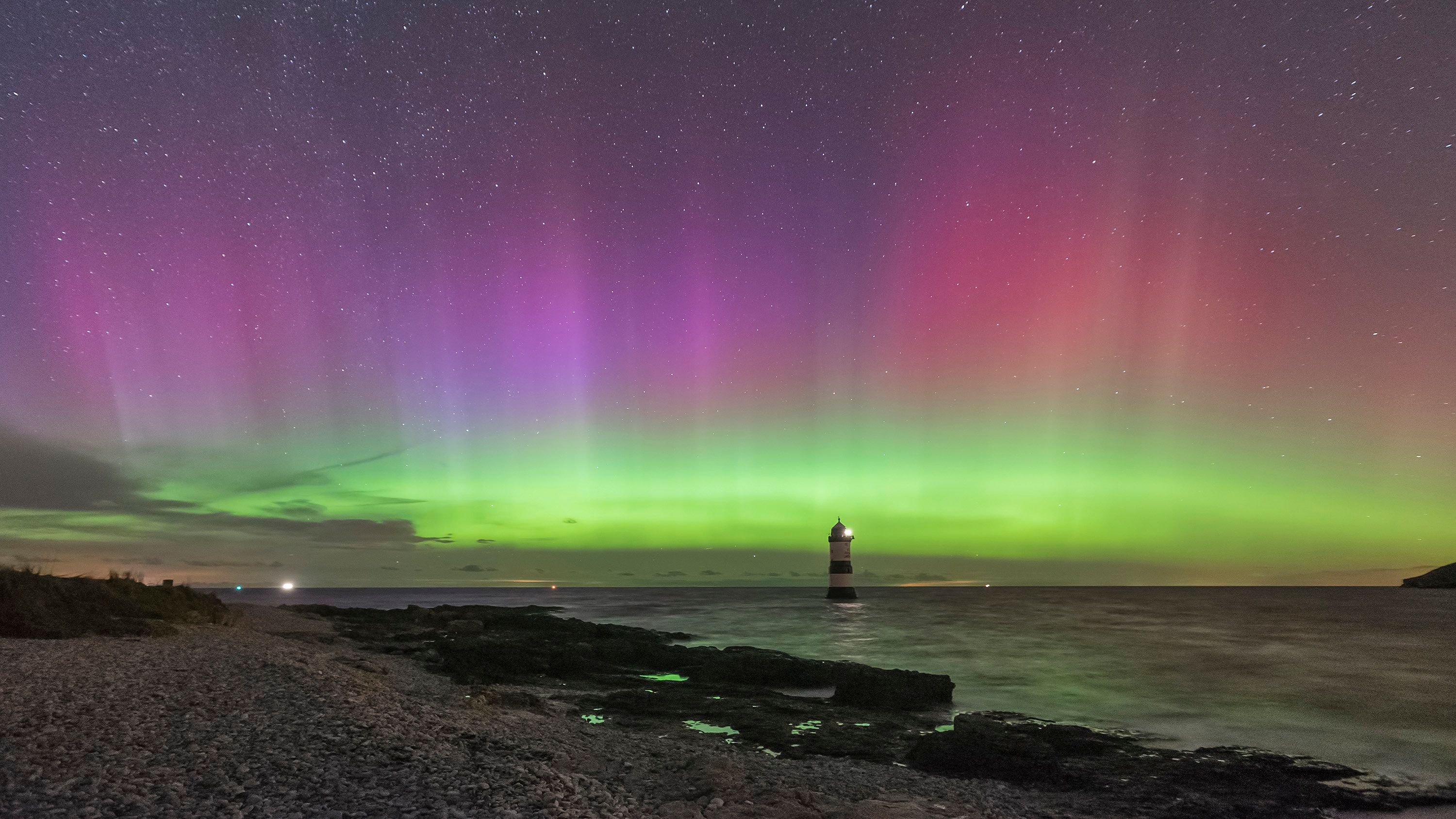 Aurora boreal iluminando o céu noturno em Penmon Point