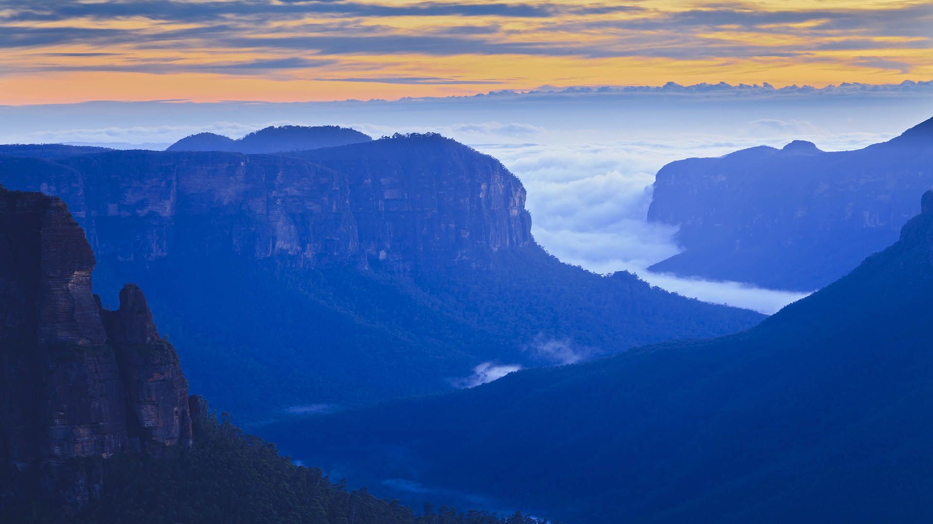 Listadas como Patrimônio Mundial, as Montanhas Azuis são um país das maravilhas de florestas antigas, vales profundos e mirantes de penhascos íngremes, tudo a apenas uma hora ou mais de Sydney. A seção da Great Dividing Range mais próxima de Sydney recebe o nome da névoa azul que sobe de milhões de eucaliptos e paira no ar da montanha, tingindo tanto o céu quanto a cordilheira.