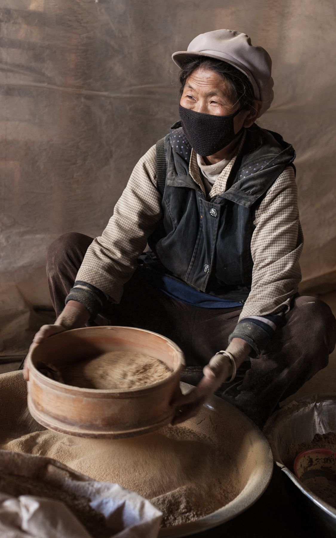 Fuligem e graxa aplicadas como protetor solar por uma idosa Bai na cidade de Tacheng