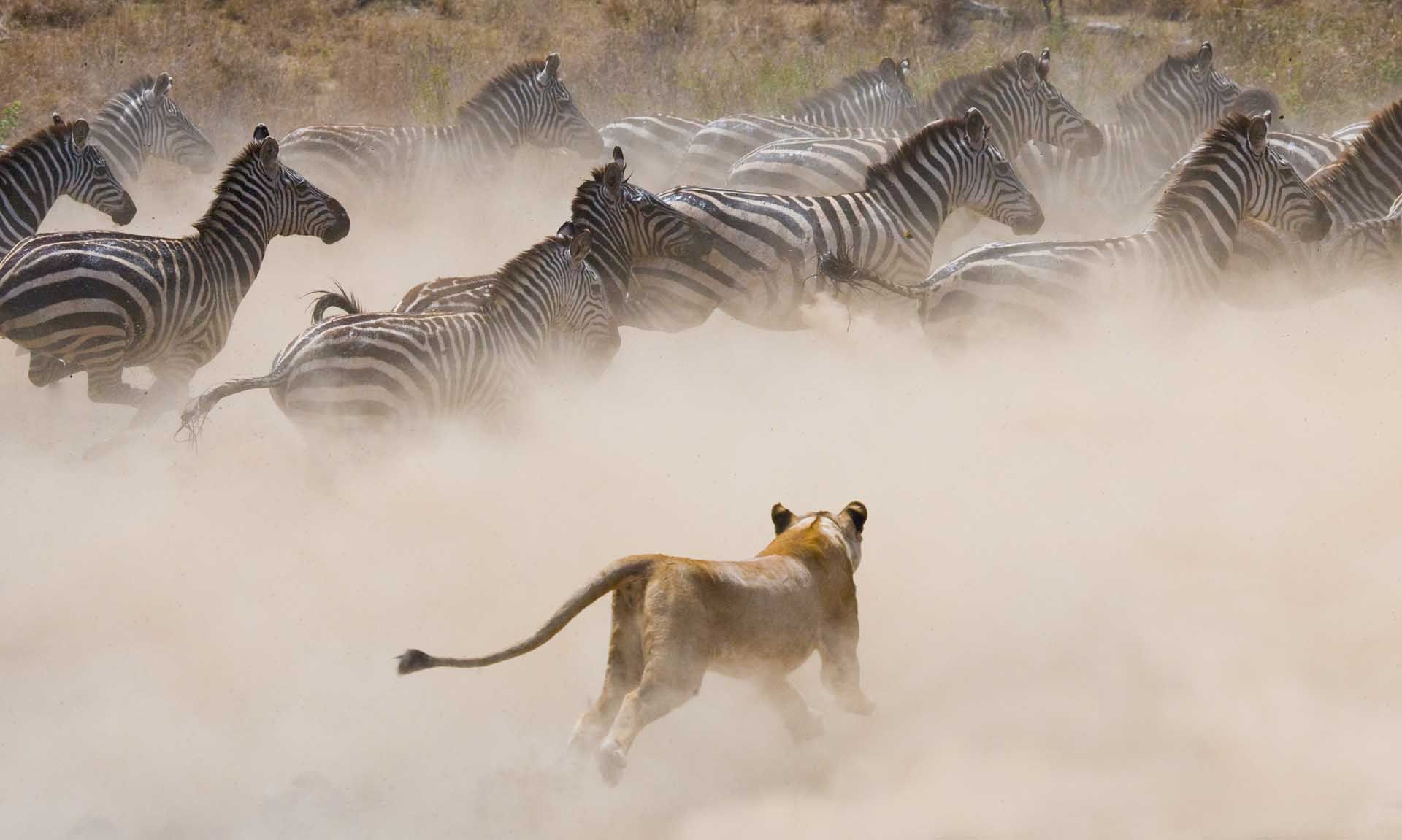 Um leão persegue um rebanho de zebras na Reserva Nacional Masai Mara © GUDKOV ANDREY / Shutterstock