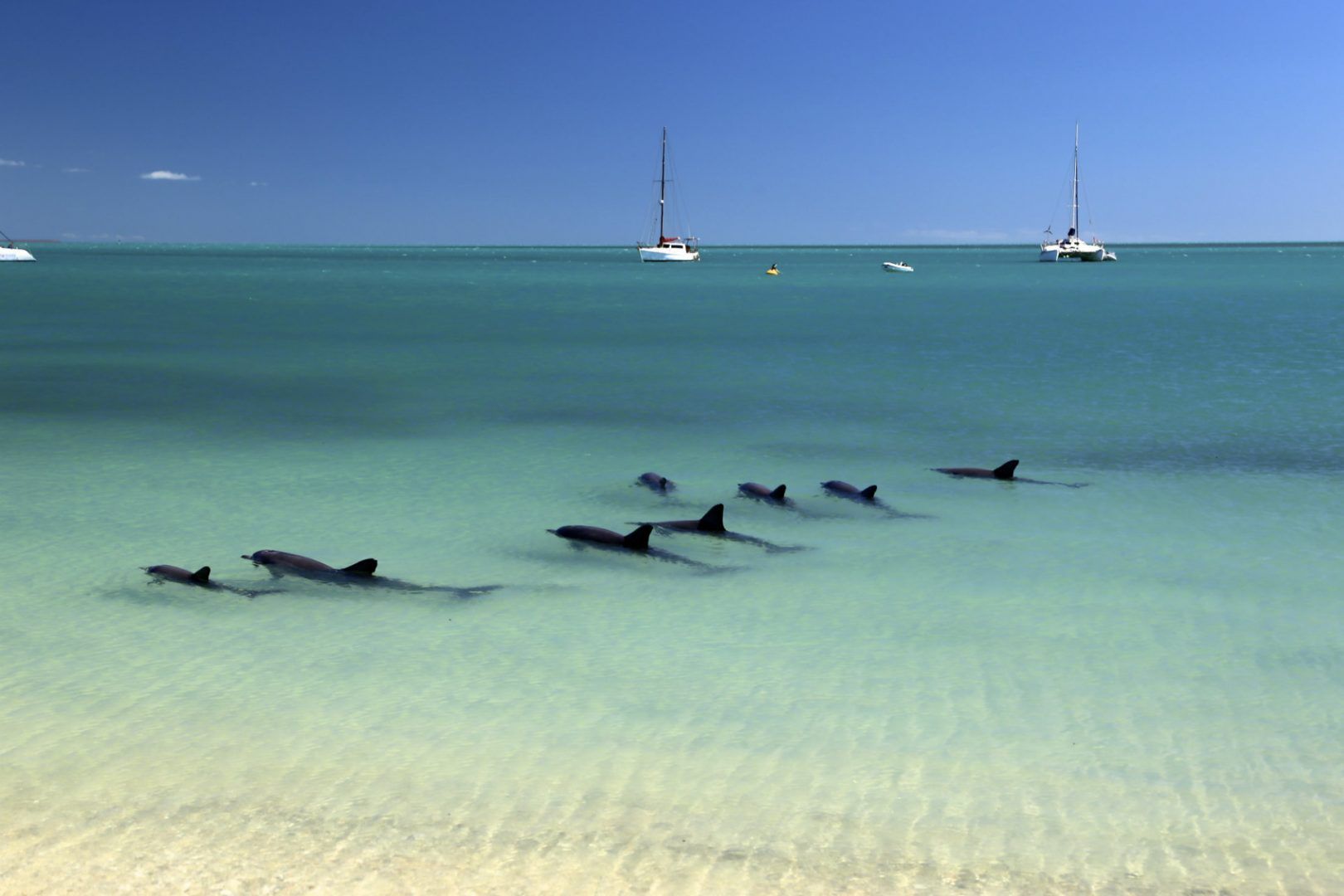 Depois de todo o hype, você pode se surpreender ao descobrir que Monkey Mia é apenas um resort e um cais perto de uma linda praia. Mas é nesta praia que muitas pessoas se aglomeram para ver as visitas quase diárias de cinco a dez golfinhos fêmeas adultas e seus filhotes, todos conhecidos pelo nome. Chegue aqui às 7h30 para assistir à primeira alimentação às 8h, depois observe-os passar a tarde em busca de comida na baía.