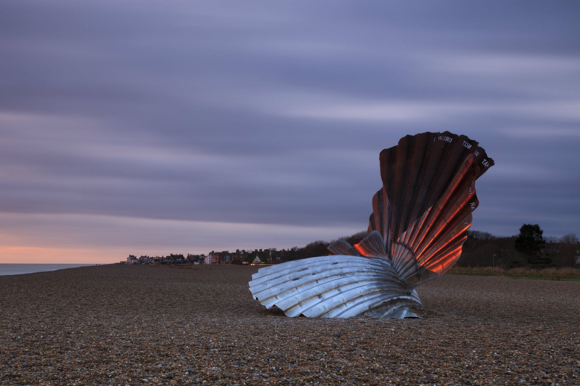 Uma elegante combinação de obras de arte, localização e memorial, a vieira tátil de aço de Maggi Hambling (2003), nascida em Suffolk, em um cenário dramático na praia, é sua homenagem ao compositor Benjamin Britten, que viveu em Aldeburgh. “Eu ouço aquelas vozes que não serão afogadas”, um verso de sua ópera Peter Grimes, é perfurado no aço, para que o céu possa ser visto além.