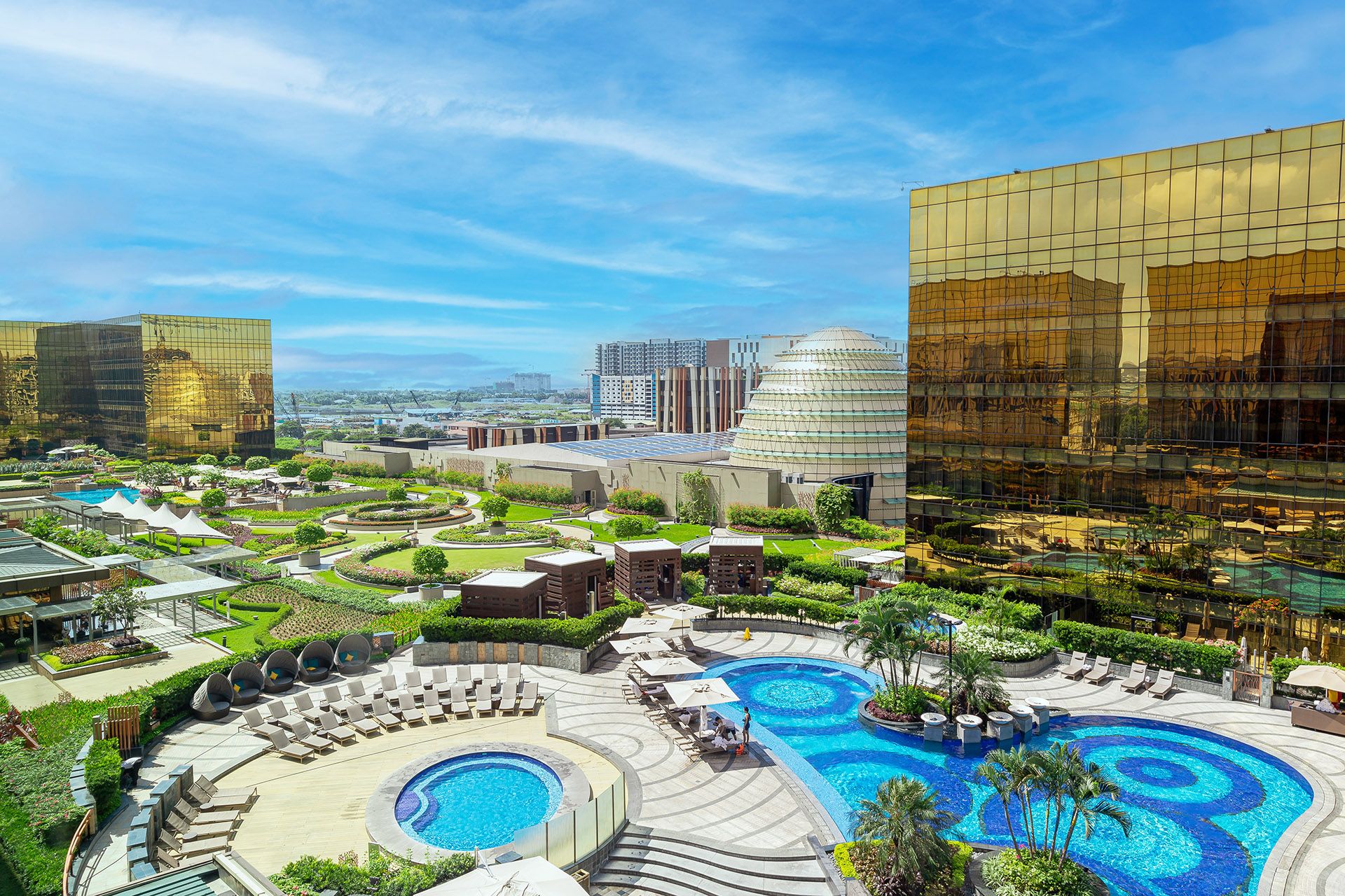 Aventure-se no vibrante centro de lazer de Parañaque, na região metropolitana de Manila, e você encontraráCidade dos Sonhos: um eco-resort e cassino cinco estrelas contemporâneo construído com base no luxo sustentável. É uma visão impressionante que oferece uma visão positiva para o futuro da capital filipina: torres elegantes e espelhadas alimentadas principalmente por painéis solares dão lugar a extensos jardins de flores contra o marco arquitetônico do “ovo da fortuna”.