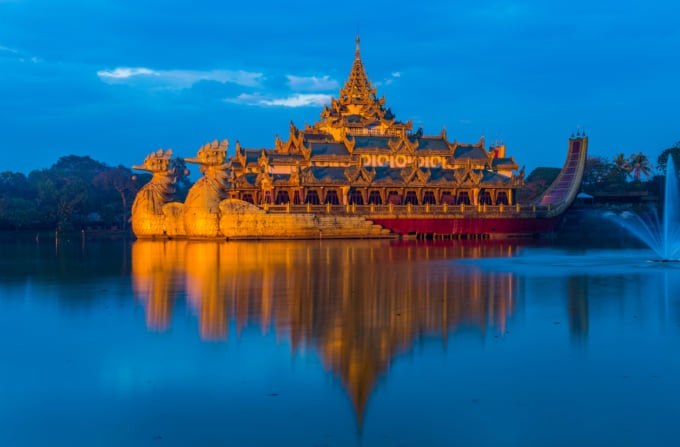 Uma das vistas mais pitorescas da cidade de Yangon é a do Palácio Karaweik, uma réplica de uma barcaça real birmanesa majestosamente pousada no Lago Kandawgyi. A barcaça é usada como restaurante e para apresentações culturais birmanesas. Embora as danças e apresentações tradicionais sejam bastante interessantes, a comida geralmente não é tão boa, então é melhor encontrar outro lugar para comer. A vista da barcaça a partir do lago é espetacular, especialmente ao pôr do sol, quando a luz brilha na barcaça real e nas águas.