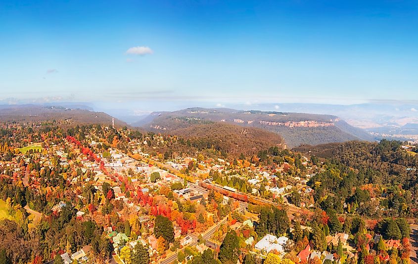 Cidade montanhosa de Blackheath nas Montanhas Azuis da Austrália – panorama aéreo em cores de outono.