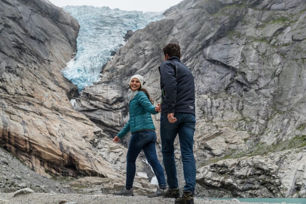 Uma das caminhadas mais emocionantes da Noruega é até a geleira Briksdal, no Parque Nacional Jostedalsbreen, perto de Olden. Existem várias rotas disponíveis, incluindo uma trilha de quase três quilômetros que sai do Mountain Lodge, que leva cerca de duas horas de ida e volta. Você seguirá o rio, passando por cabras montanhesas e cachoeiras para chegar a Briksdal.
