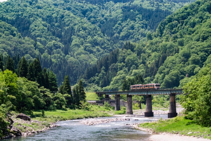 A Linha Tadami de Fukushima oferece uma viagem de tirar o fôlego por paisagens montanhosas, desfiladeiros dramáticos e vales serenos enquanto segue em direção à província de Niigata. Ao longo do percurso, há diversas paradas cativantes, incluindo a cidade de Mishima, considerada uma das mais belas vilas do Japão. No entanto, observe que o trecho entre Aizu-Kawaguchi e a Estação Tadami permanece fechado devido aos danos causados pelo desastre de 2011. Para preencher esta lacuna, estão disponíveis autocarros para transportar passageiros entre estas estações.