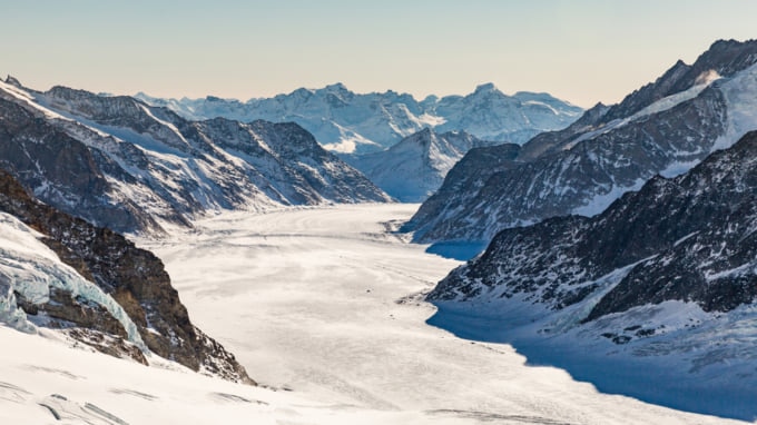 A Geleira Aletsch é a maior geleira de toda a cordilheira dos Alpes da Suíça. É composto por quatro geleiras diferentes que convergem em um ponto cuja espessura foi estimada em mais de 800 metros de gelo. Faça uma curta caminhada apreciando as vistas surpreendentes da geleira inferior ou, para algo um pouco mais desafiador, você pode obter vistas panorâmicas incríveis de toda a geleira a partir de cabanas localizadas no alto das montanhas.