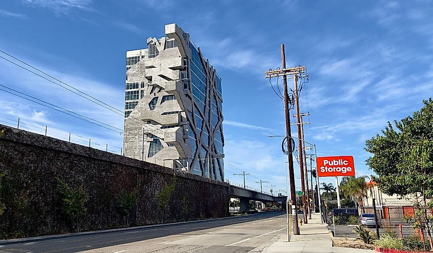 Uma torre de escritórios de 16 andares, projetada por Eric Owen Moss, em West Adams, Los Angeles. Crédito da imagem vesperstock via Shutterstock