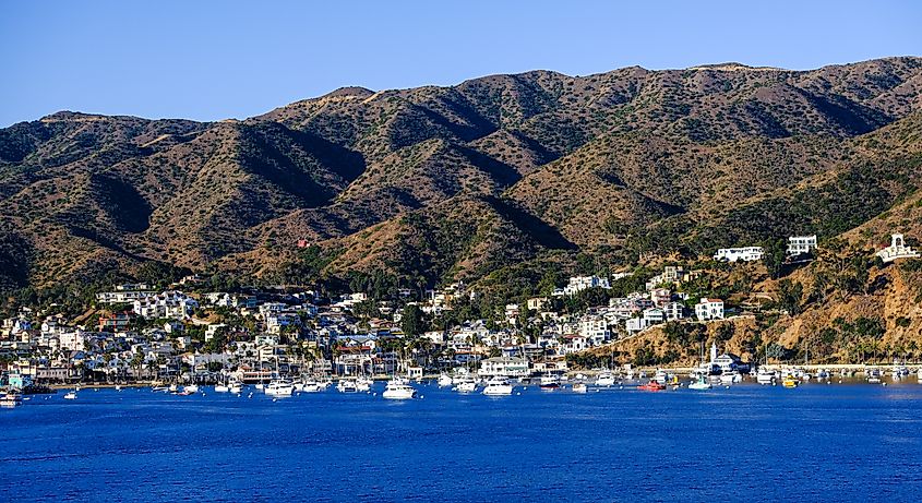 Avalon é uma comunidade turística com orla marítima dominada por empresas voltadas para o turismo na Ilha de Santa Catalina. Crédito editorial: Darryl Brooks/Shutterstock.com