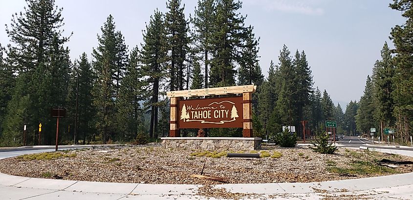 A placa Bem-vindo a Tahoe City em Tahoe City, Califórnia.
