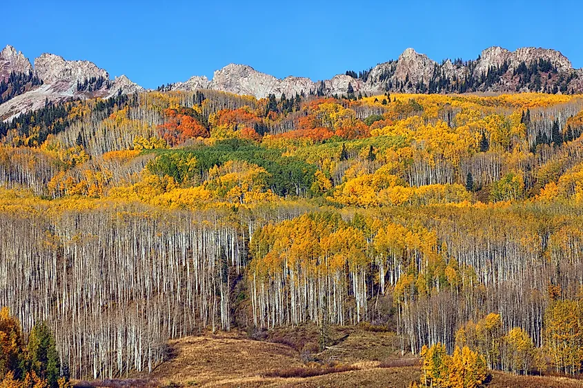À medida que o outono chega ao Vale do Rio Slate, Crested Butte começa sua transformação mais colorida, quando os bosques de álamos que cercam a cidade adquirem tons brilhantes de ouro e âmbar. Outrora um assentamento de mineração de carvão, agora é um dos destinos de outono mais deslumbrantes do Colorado. O passeio panorâmico ao longo de Kebler Pass revela 80 quilômetros quadrados de álamos deslumbrantes perto da montanha West Beckwith, enquanto a trilha 403 serpenteia por encostas arborizadas levando a vistas deslumbrantes das montanhas pintadas em tons de fogo.