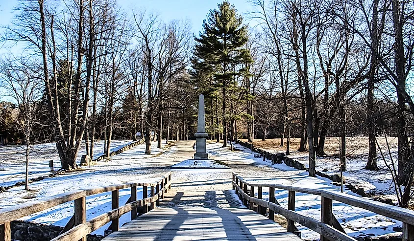Ponte coberta de neve e árvores em Bradford, Massachusetts. Crédito da imagem Marie Christiane via Shutterstock