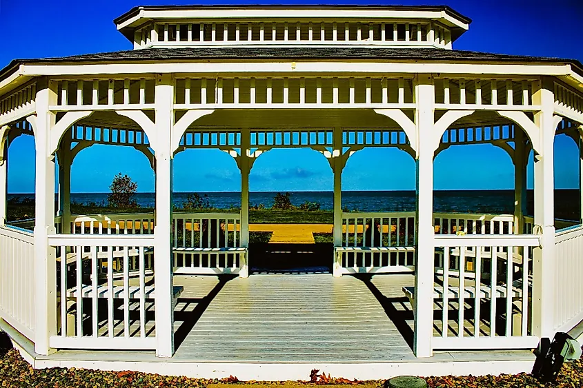 Um gazebo emoldurado com vista para o Lago Erie da vila de Geneva-On-The-Lake.