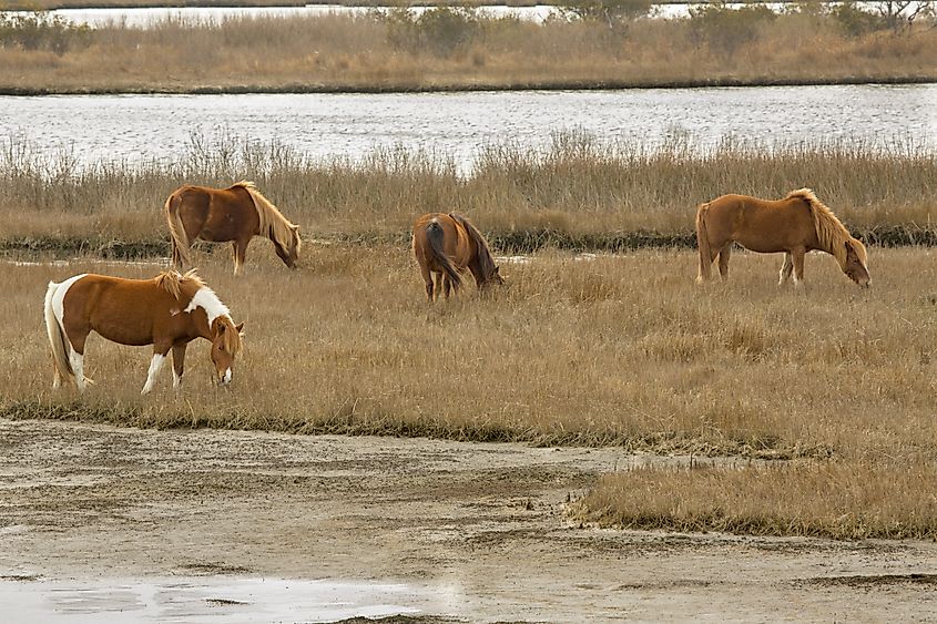 Pôneis selvagens pastando no final do inverno em Assateague. Shutterstock.com
