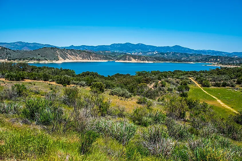 Vista do Lago Cachuma e das colinas verdes da Floresta Nacional Los Padres acima e do Vale de Santa Ynez, no centro do condado de Santa Bárbara, Califórnia.