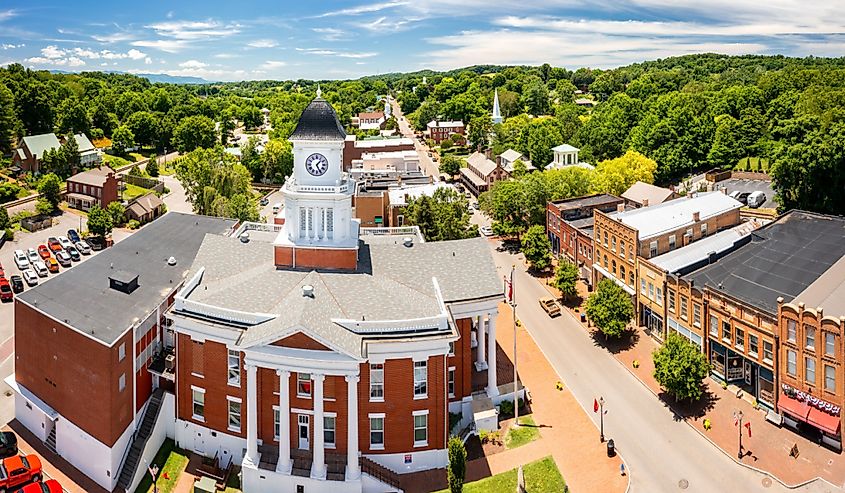 Vista aérea da cidade mais antiga do Tennessee, Jonesborough, e do seu tribunal.