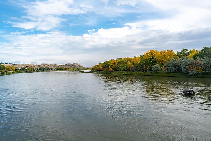 Rio Missouri em Fort Benton, Montana, com um barco flutuando rio abaixo.