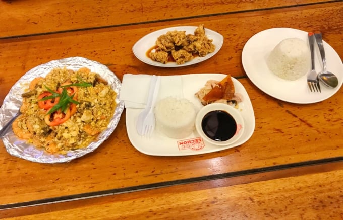 Aqui você pode saborear camarão com alho, frango com alho e lechon! A comida filipina tem um sabor forte, por isso combina bem com arroz.