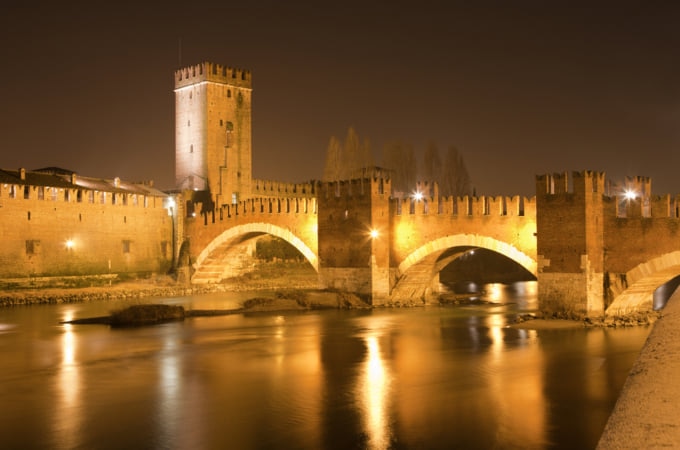 A Ponte Scaligero, ou Ponte Castel Vecchio, é uma ponte fortificada localizada na cidade de Verona. Situada sobre o rio Adige, a Ponte Scaligero apresenta arcos segmentados. A ponte também apresenta o maior vão do mundo na época de sua construção. A Ponte Scaligero é composta por tijolo vermelho na parte superior. Nas partes inferiores, por outro lado, avistava-se mármore branco. A ponte também consiste em três vãos de comprimento decrescente que partem de quadrados pentagonais. Ao passear por Verona, você viu a Ponte Scaligero.